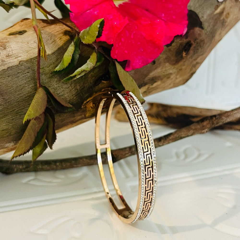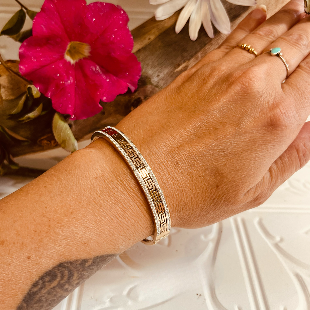Stunning rose gold bangle, featuring the greek key design with tiny clear crystals half way around the band