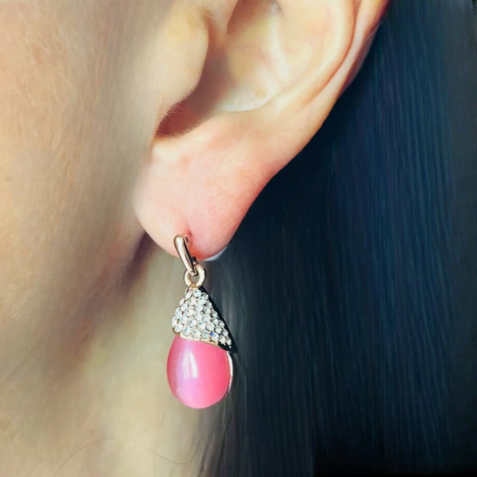 Pretty rose gold earrings, featuring tiny clear crystals at the top and a pink stone