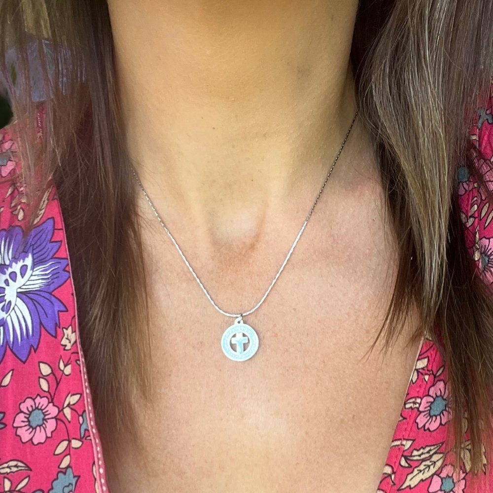 This classic silver stainless steel necklace, featuring a cross surrounded by tiny clear crystals. Perfect for day or night wear