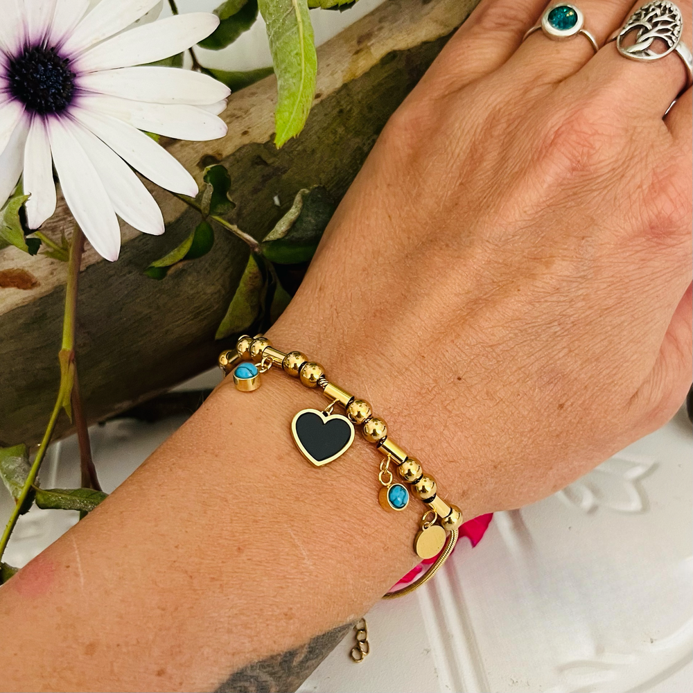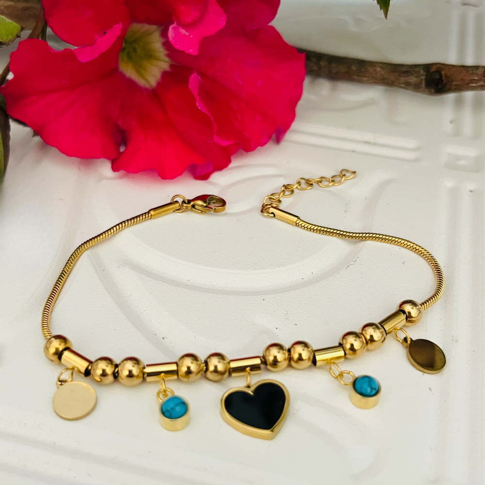 Gold charm bracelet with hanging black heart and pretty charms with a extender chain to fit various wrist sizes