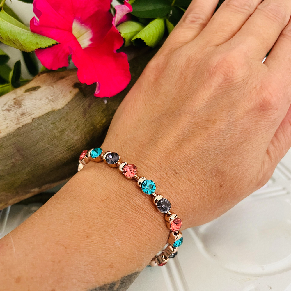 Gorgeous rose gold bracelet, featuring sparkling crystals in aqua, lilac and pink. With a secure clasp