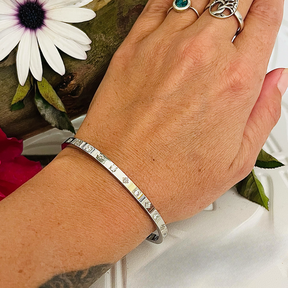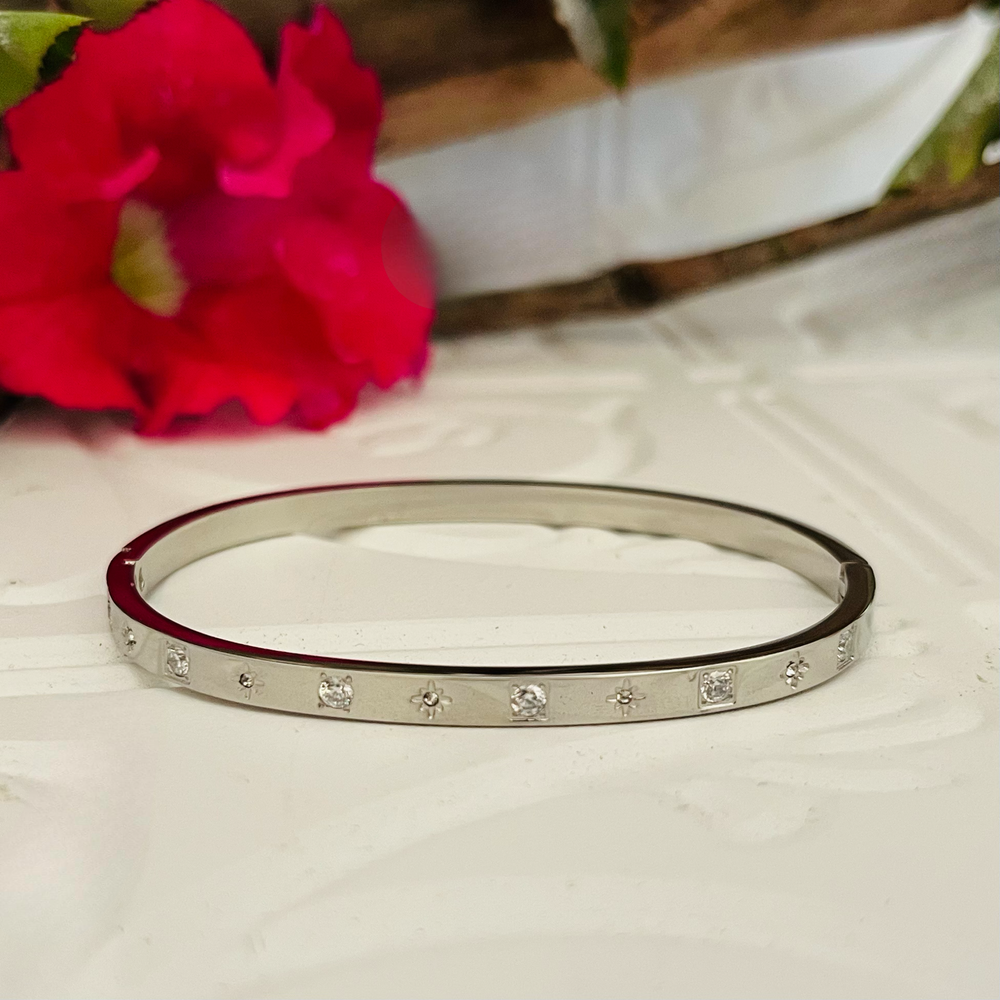 Silver Bangle With Stars & Square Clear Crystals