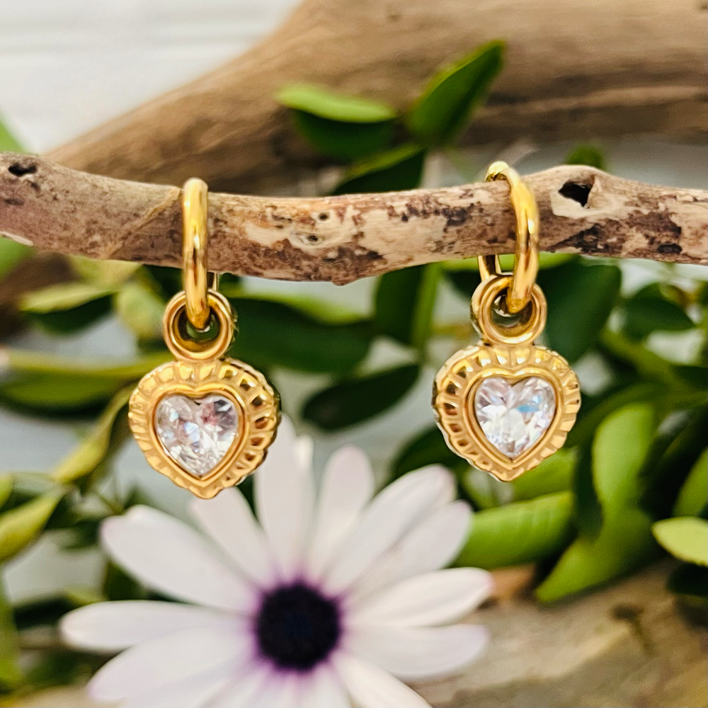 Stainless steel gold heart earrings, featuring a sparkling clear crystal in the middle