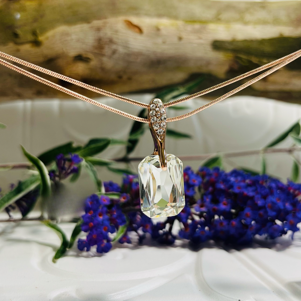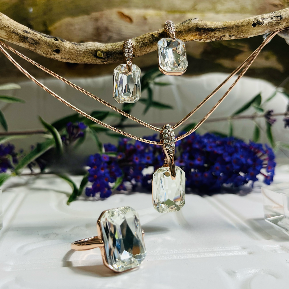 Elegant rose gold set, featuring gorgeous clear crystal in the double chain necklace, ring and earrings. Perfect for dressing up or down . Quality Plating and exceptional sparkling cubic zirconia crystal. You won’t be disappointed.