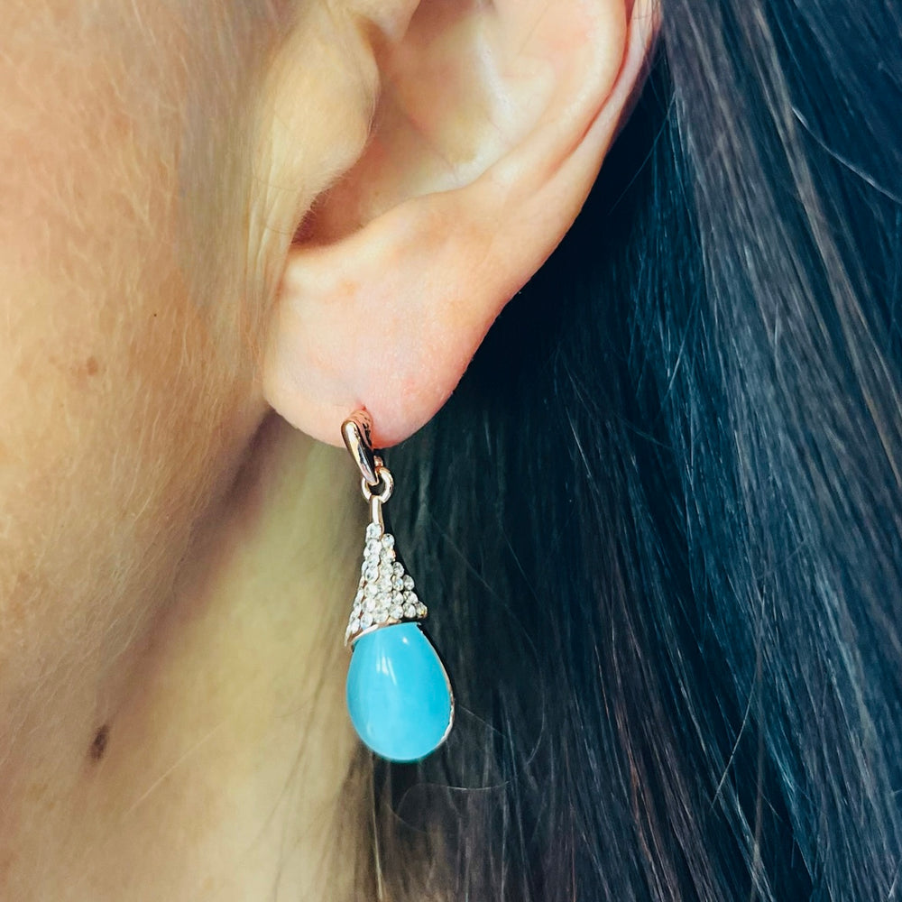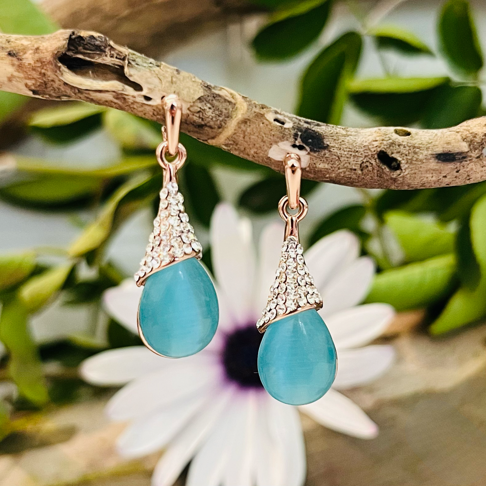 Pretty rose gold earrings, featuring tiny clear crystals at the top and a light aqua stone