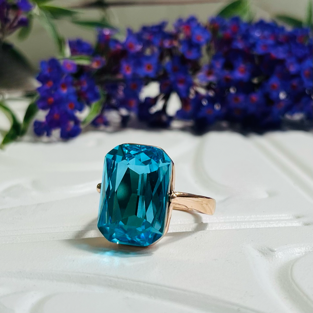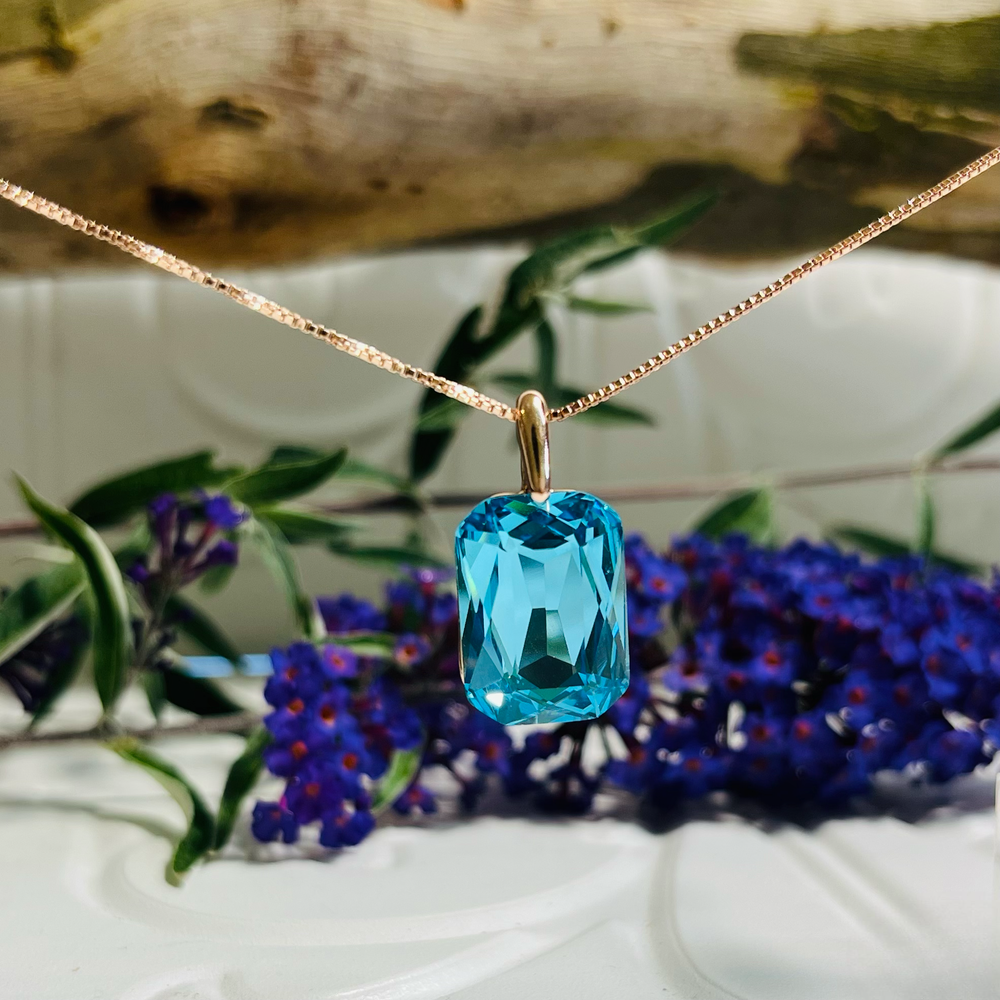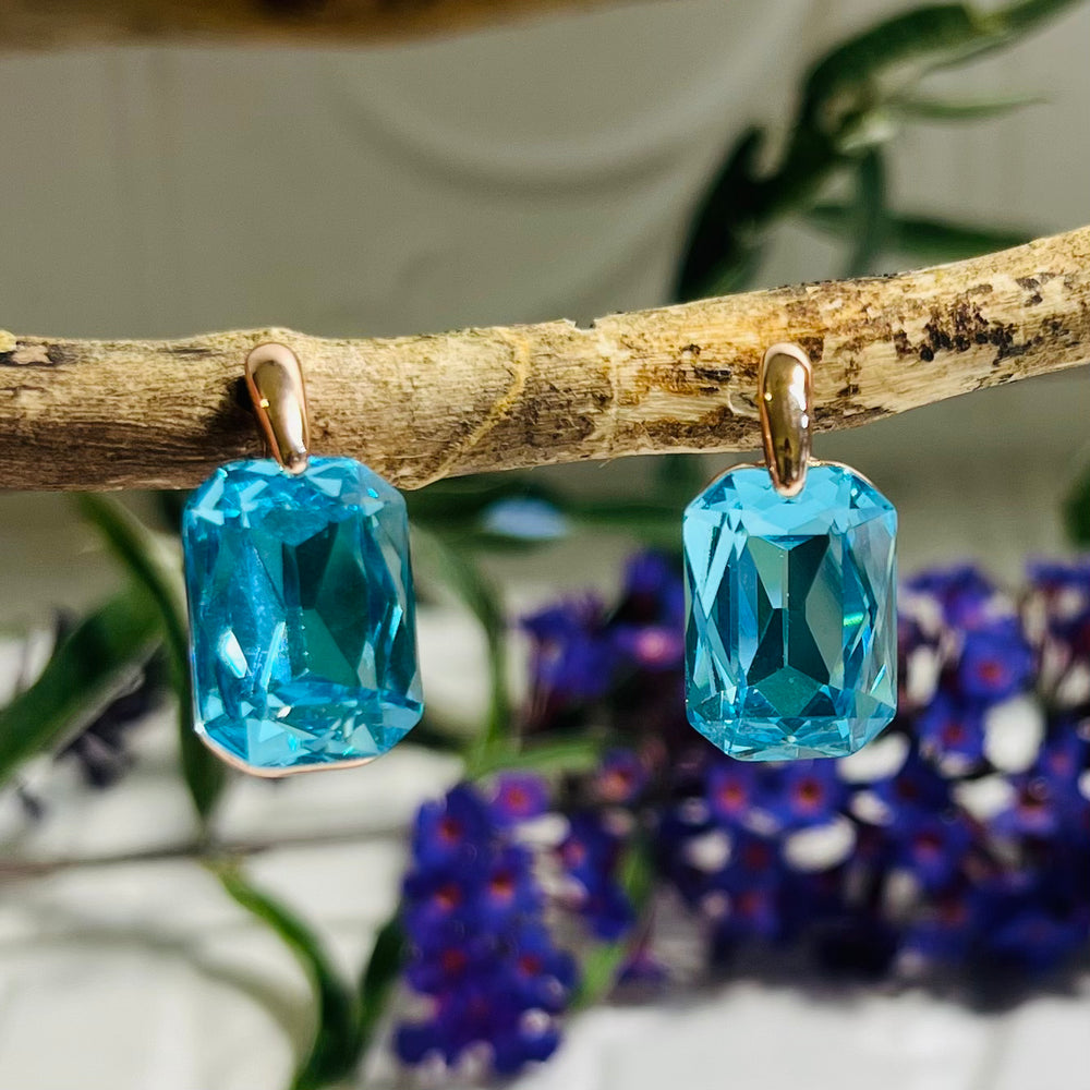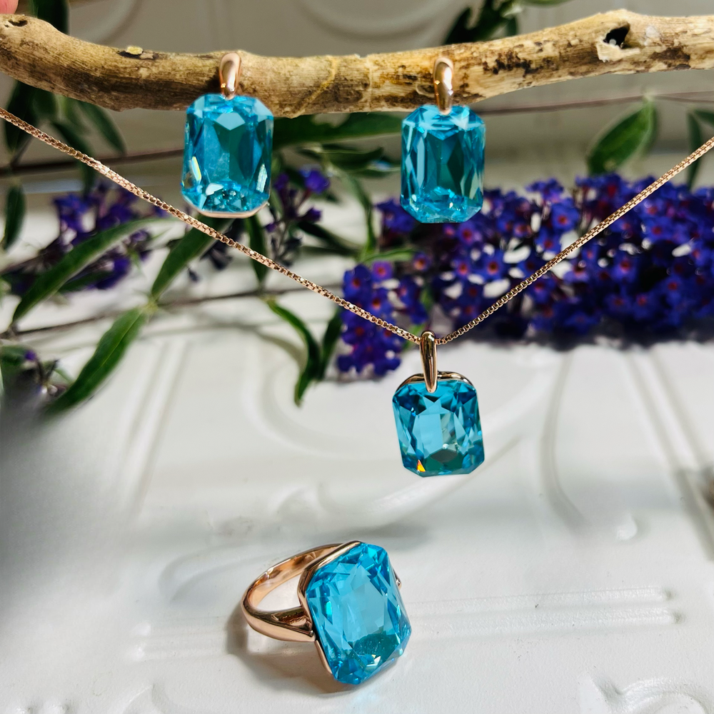 Eye catching, rose gold set, featuring gorgeous sparkling aqua crystals in necklace, ring and earrings. Perfect for dressing up or down . make a statement with this gorgeous set , quality rose gold plating with high quality cubic zirconia stones :